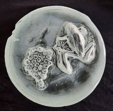 Ingedroogde gevonden kikker en gemodelleerde klei als mal voor deze glascasting over de levenscyclus.